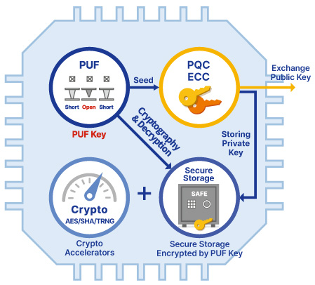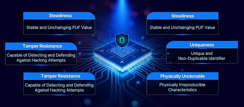 PUF (Physically Unclonable Function) creates a unique, unclonable identity within each chip — forming the hardware root of trust that enables truly secure systems.
