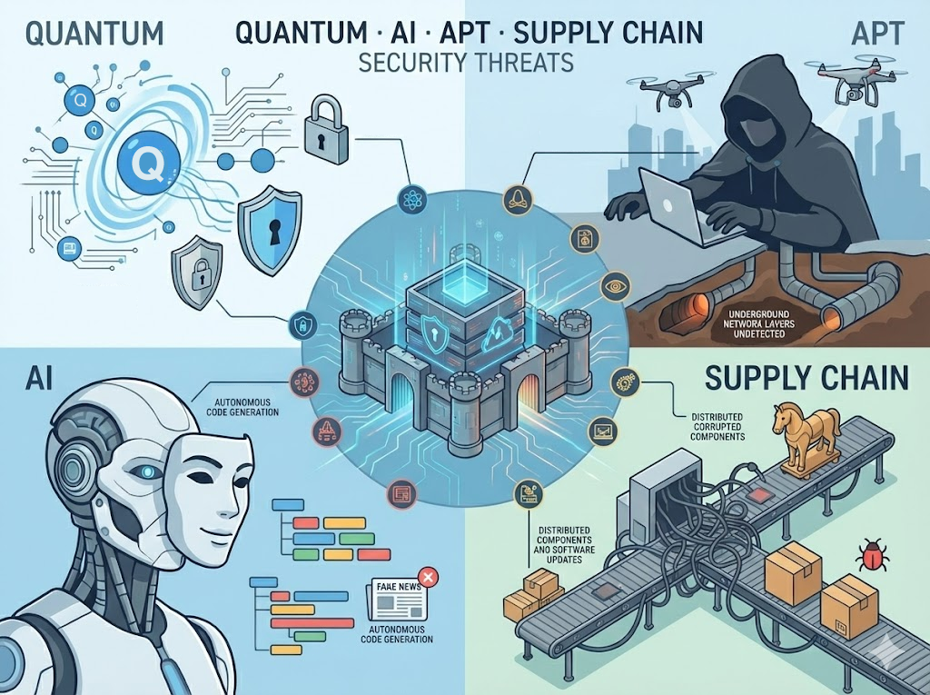 We are witnessing the evolution of a new, hostile ecosystem where four distinct threat vectors are interacting and converging: Quantum, AI, APT, and Supply Chain.